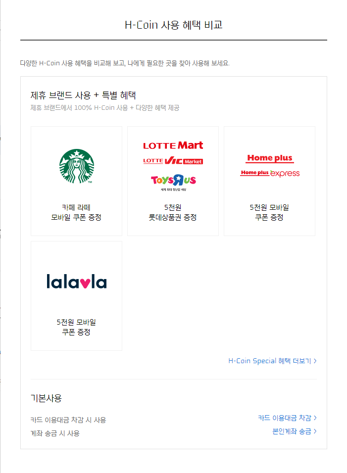 'Hyundai Card' 하단의 'H-Coin 사용 혜택 비교' 버튼을 클릭