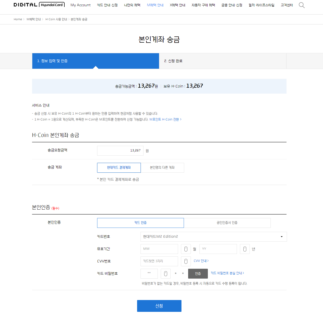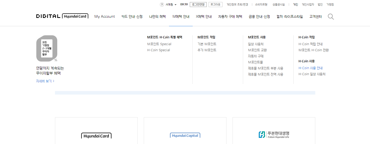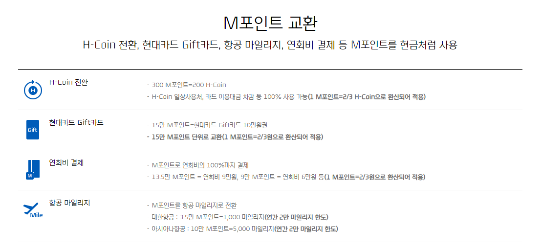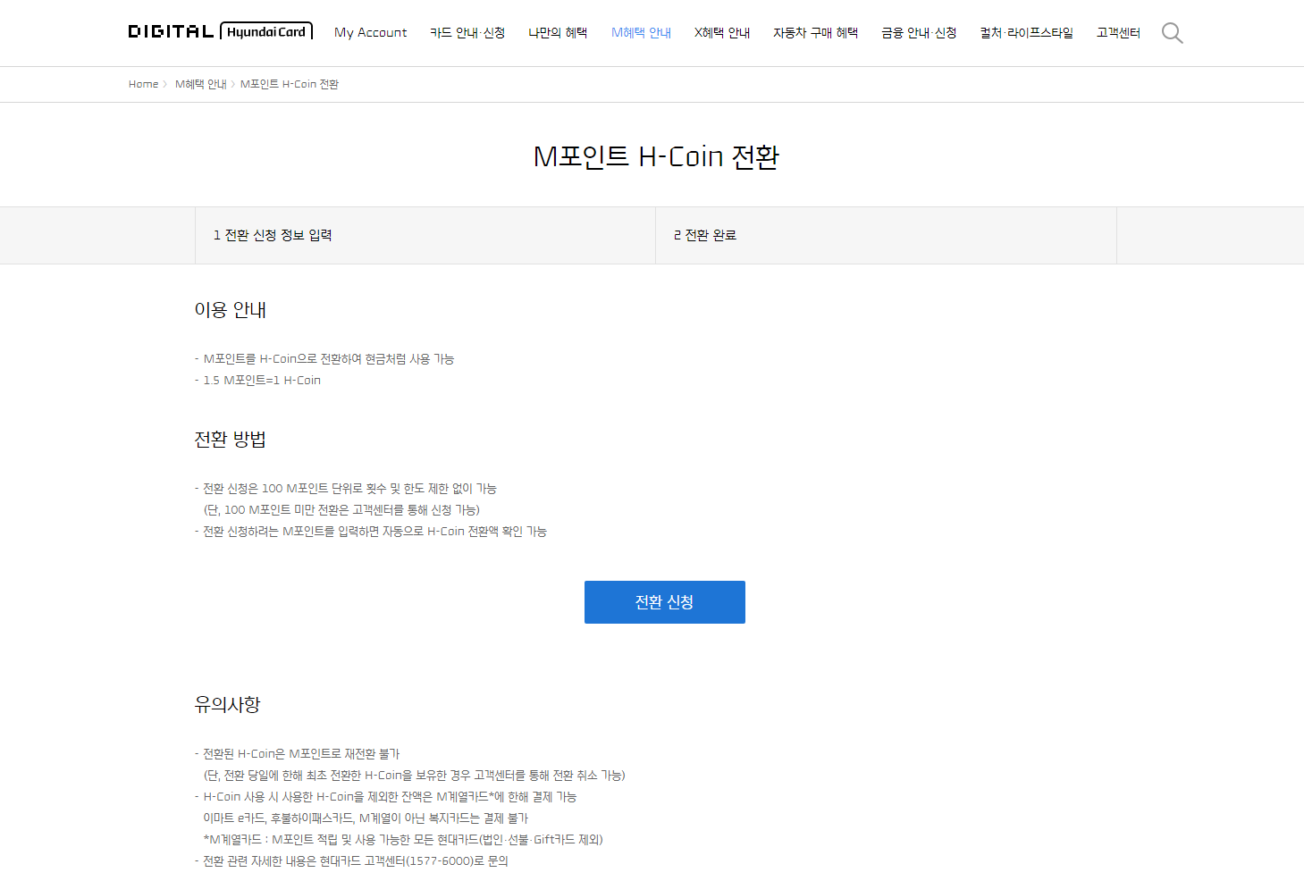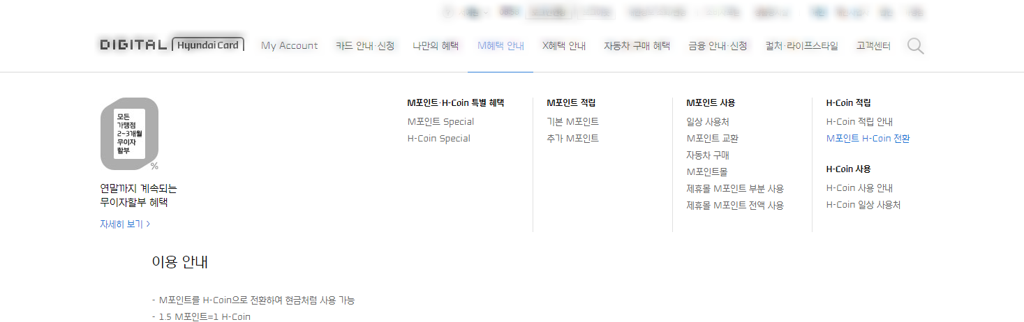 상단 메뉴 중 'M혜택 안내'를 열어서 'M포인트 H-Coin 전환'를 클릭한다.