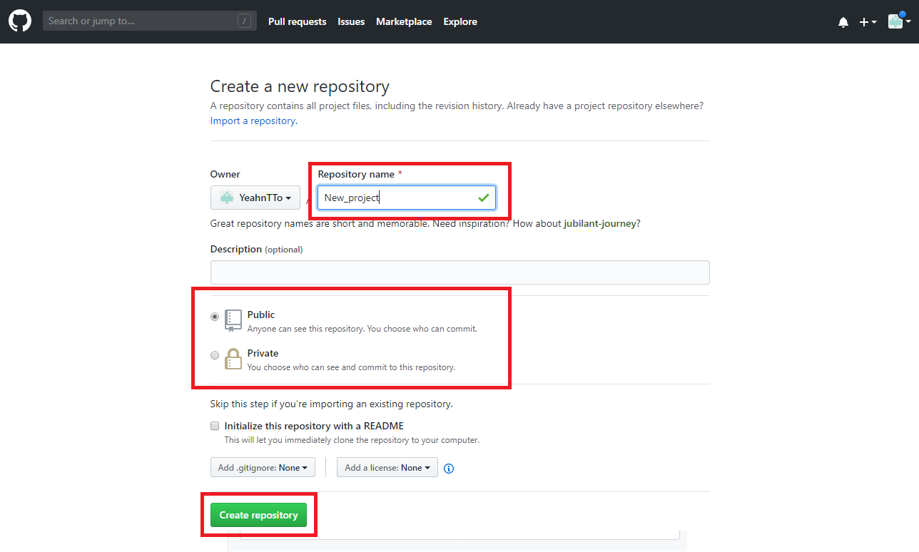 그리고 새로운 저장소의 정보를 입력하고 Create repository버튼을 클릭하면 생성완료