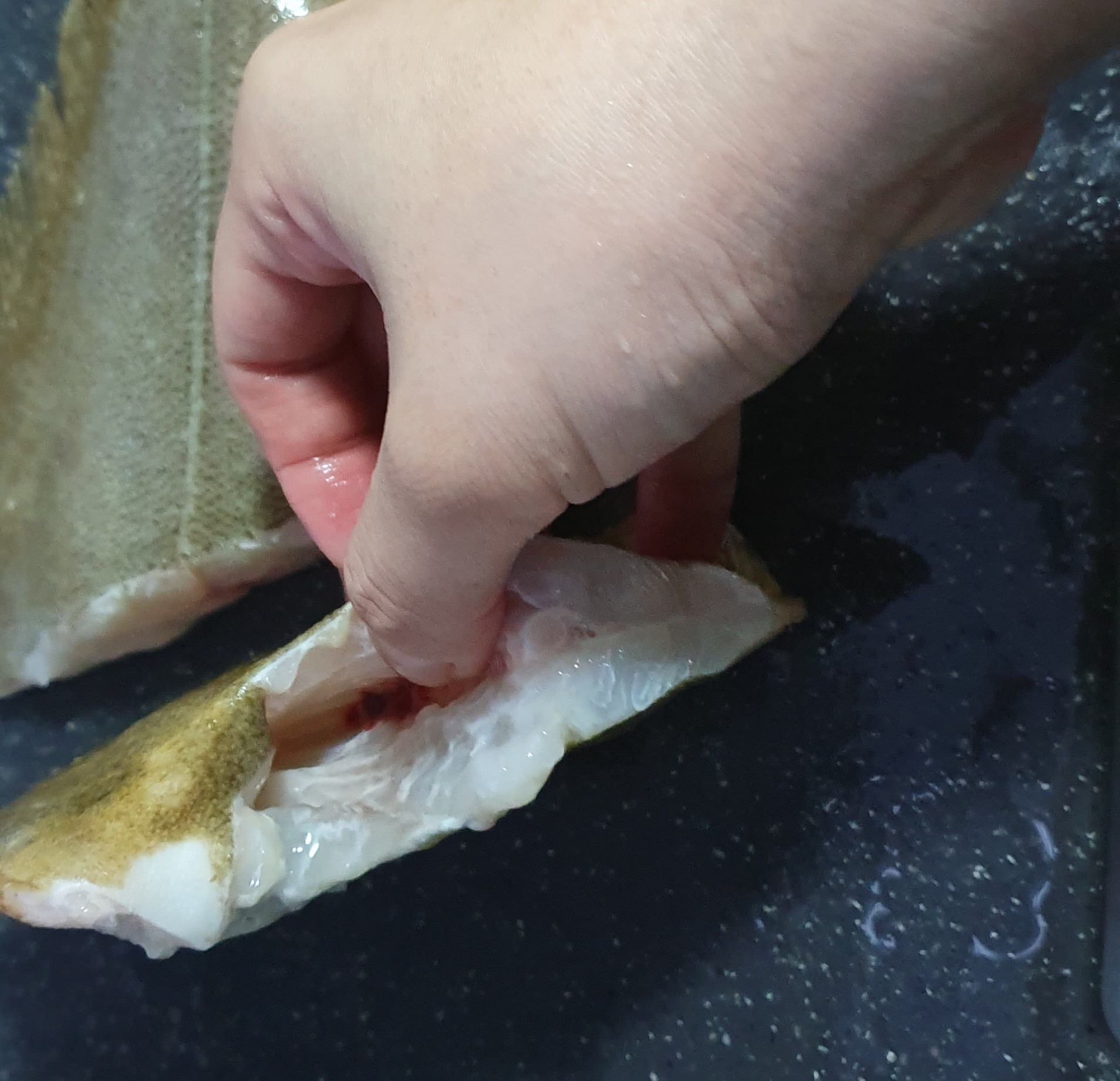 최선을 다해 힘껏 꼬리를 자르고 뼈에 막혔을경우 뒤집어서 같은 위치를 힘껏 잘라 살을 가르면 뼈가보인다.