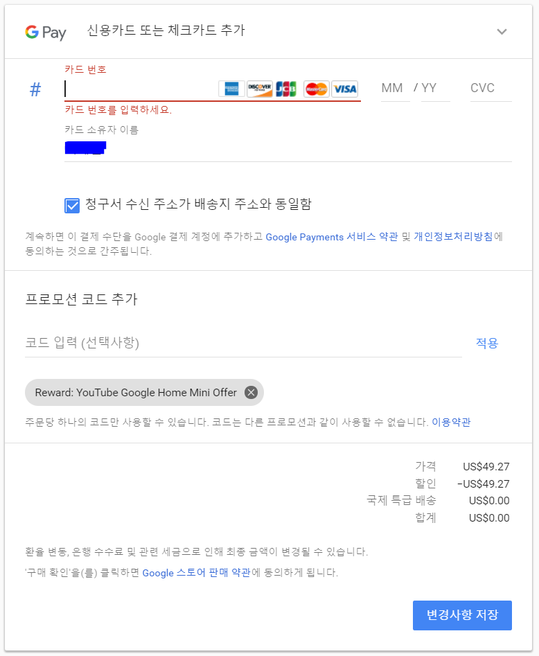 결제정보를 추가하거나 기존에 있는 정보를 업데이트 하여 결제정보입력을 마무리한다.