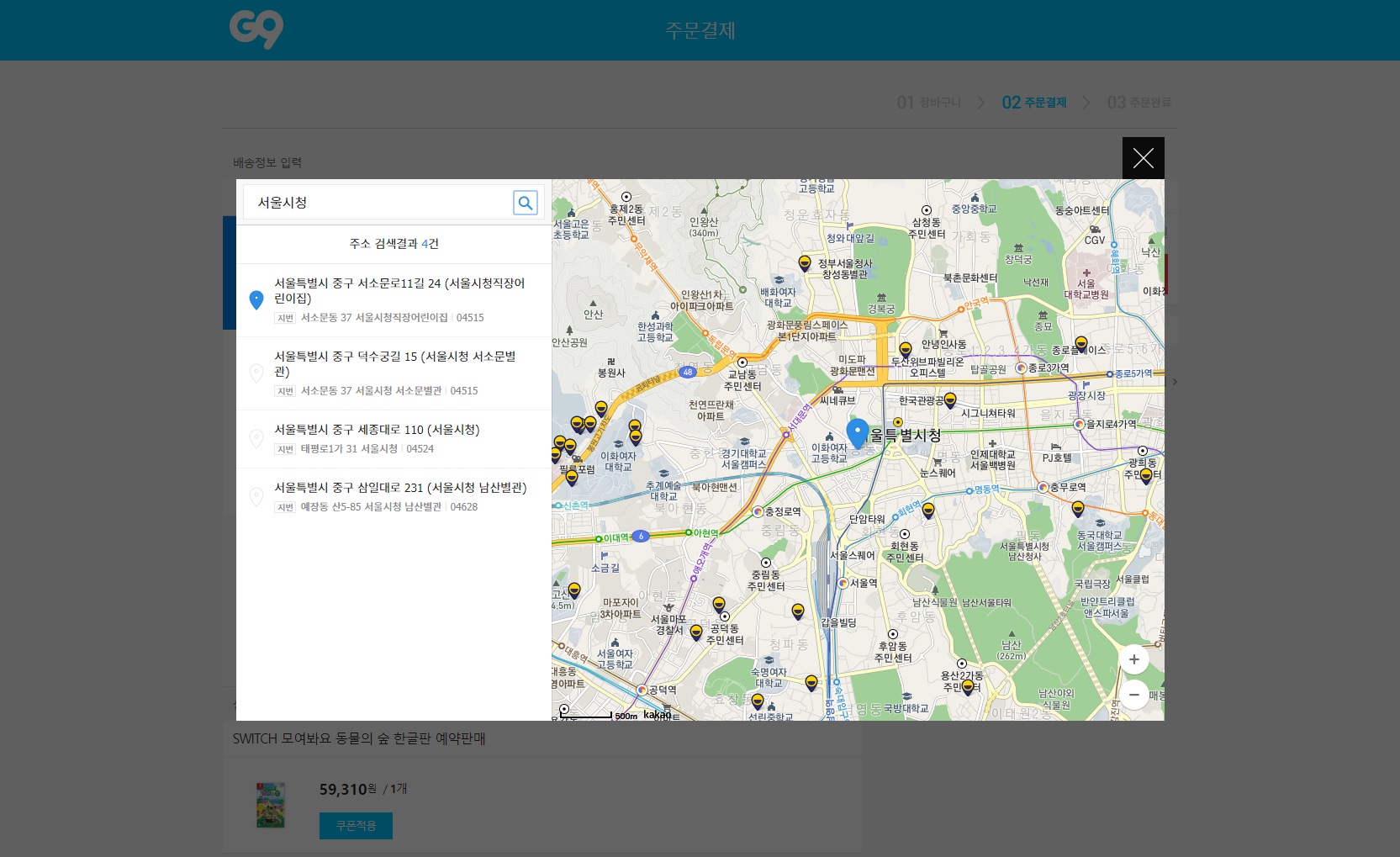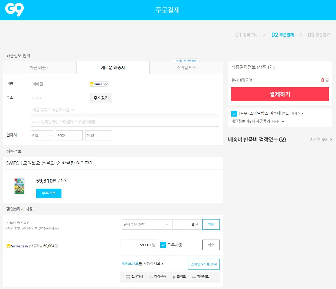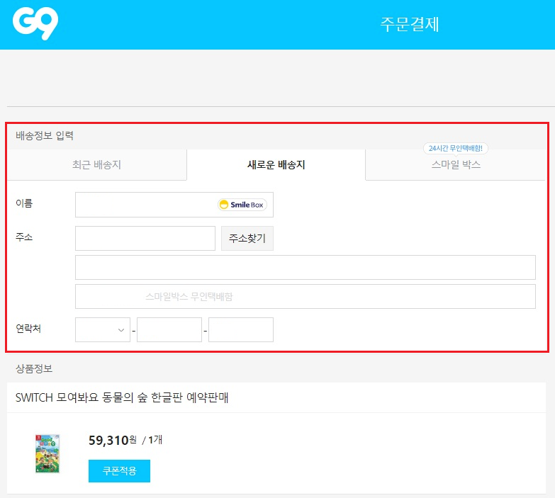 선택완료 후 다시 결제페이지로 돌아오면 새로운배송지에 스마일박스 주소가 적힌다.