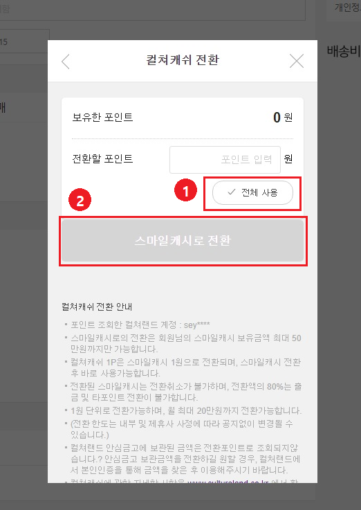 "전체사용"을 클릭하고 "스마일캐시로 전환"버튼을 클릭한다!