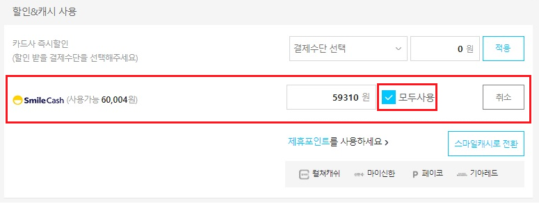그러면 할인&캐시사용 영역에 사용가능금액이 찍힌다.