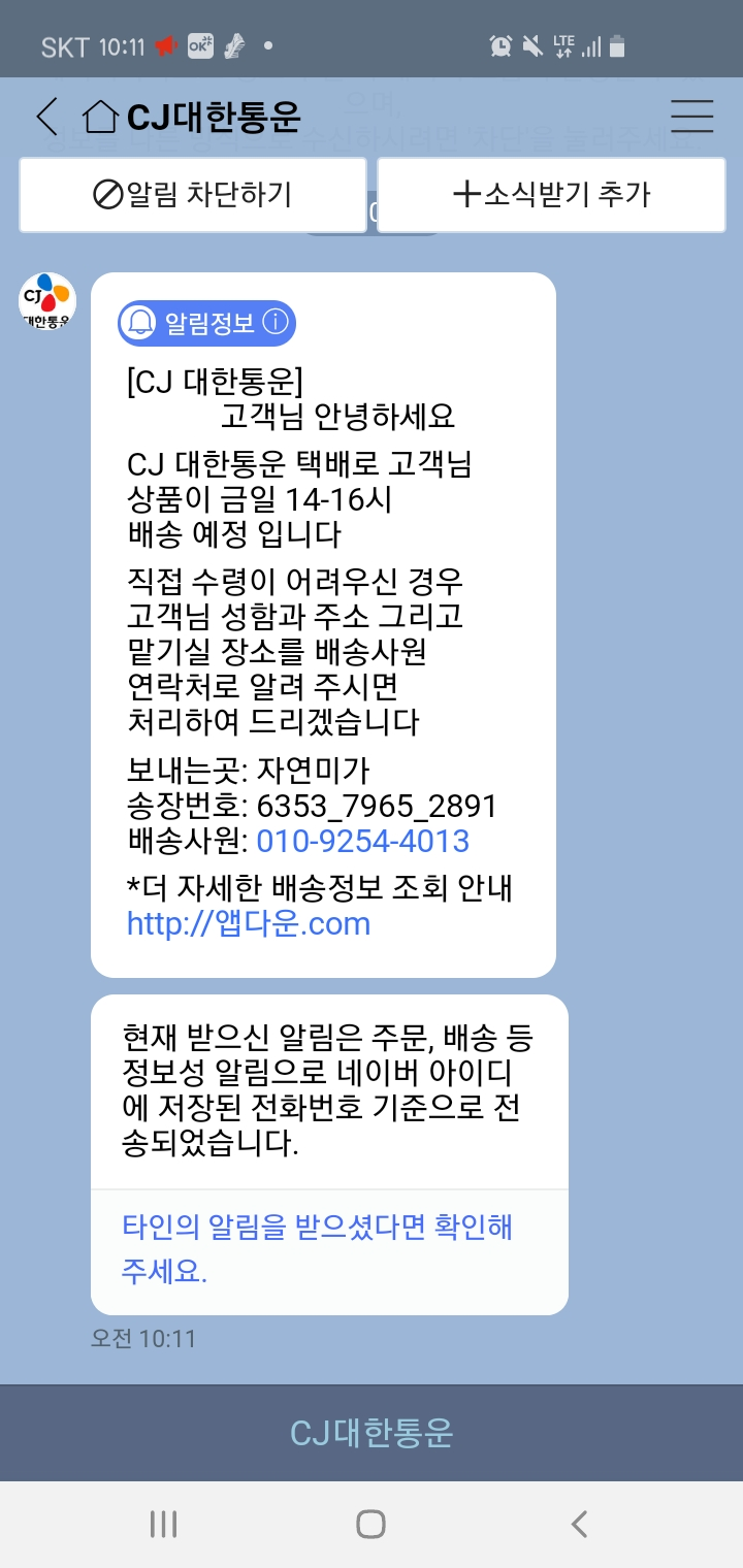오예!!! 오전에 바로 이렇게 대한통운 알림 메시지가 왔다!!