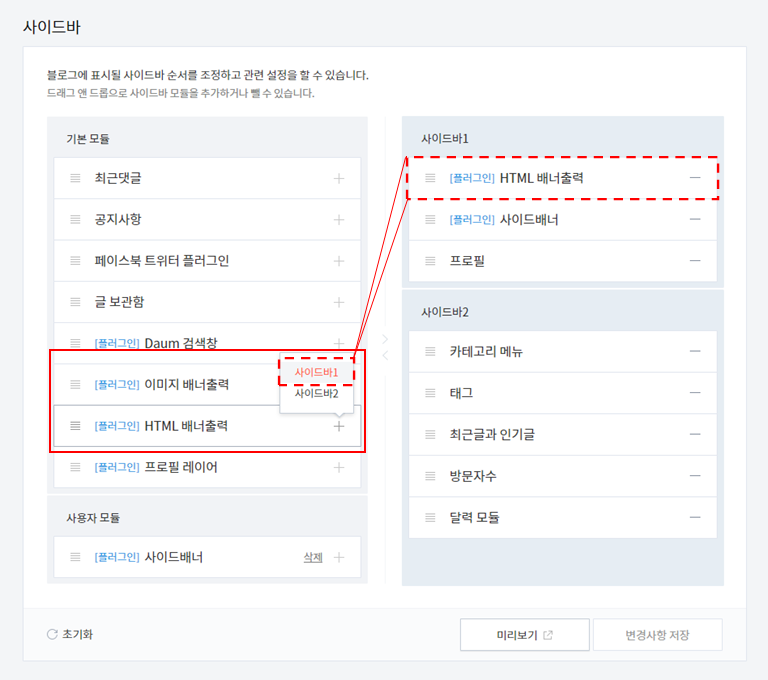 나는 '사이드바1'에 추가하여 해당위치에 플러그인이 추가되었다.