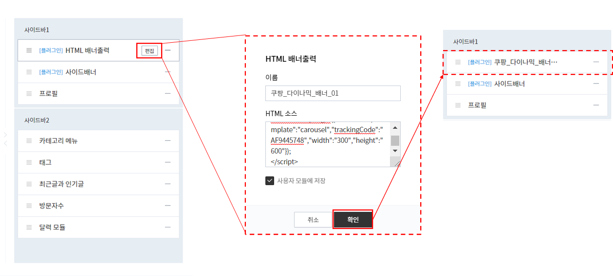 기본 모듈중에 'HTML 배너 출력'을 추가 한다.