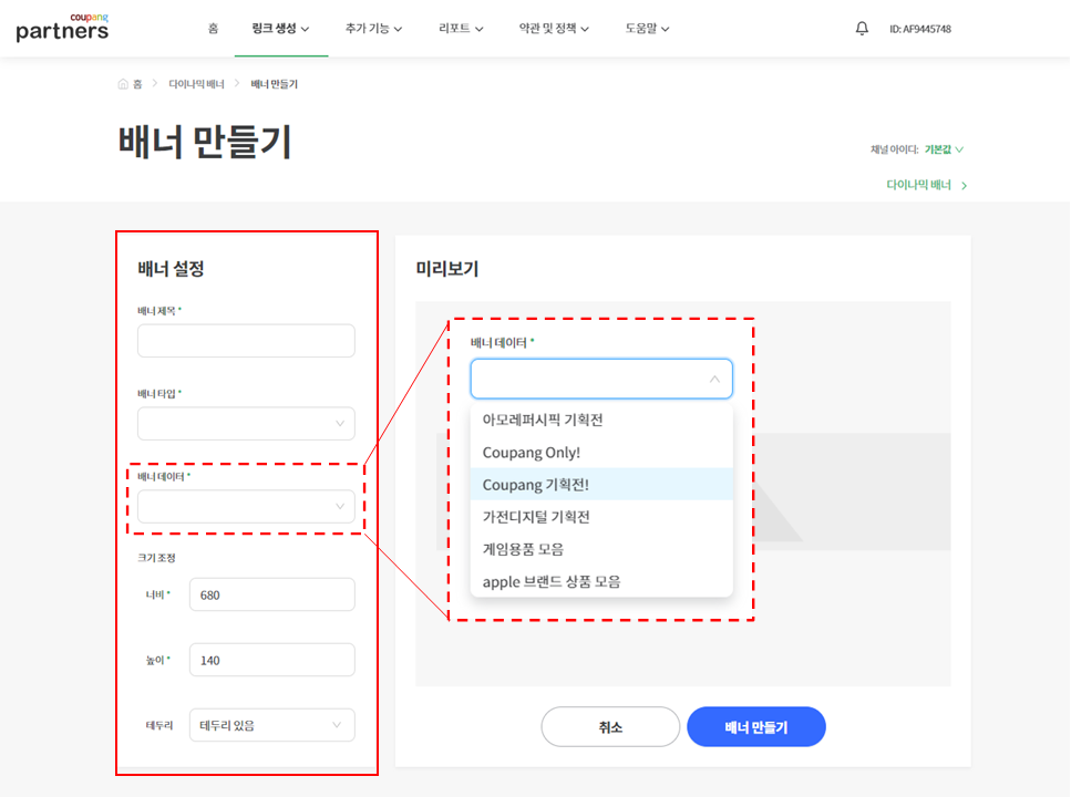 그리고 배너만들기를 클릭한다.