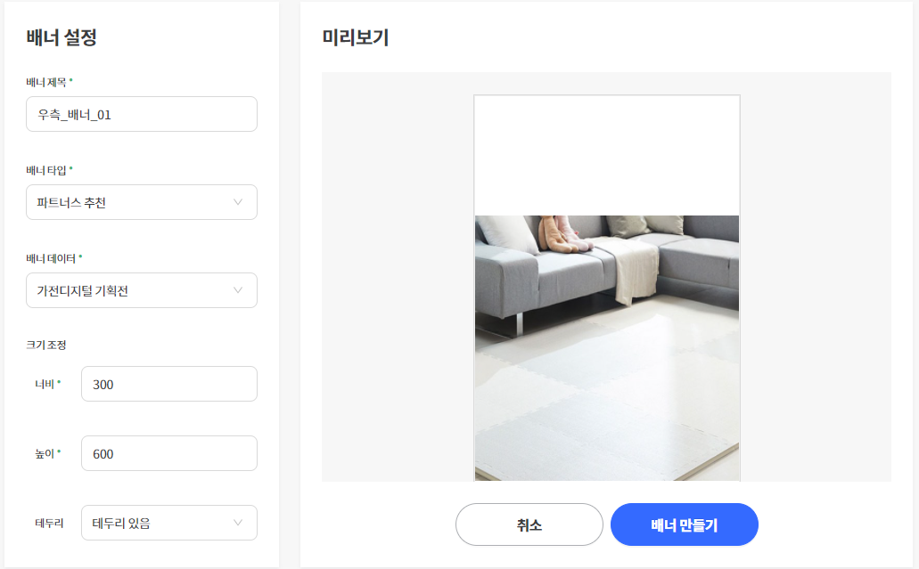 따라서 배너설정의 너비를 300으로 하고