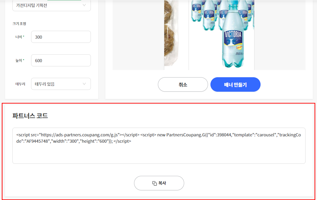 하단에 파트너스 코드 영역이 생기면서 스크립트 코드가 나온다.