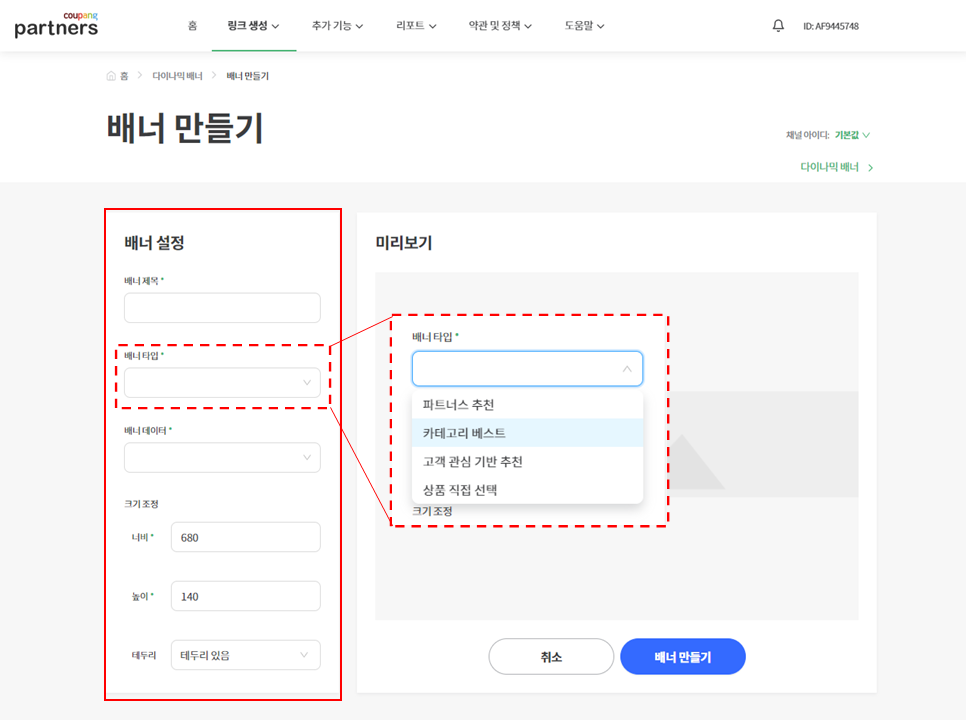 그리고 배너만들기를 클릭한다.