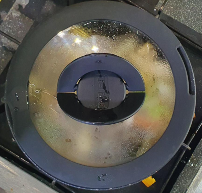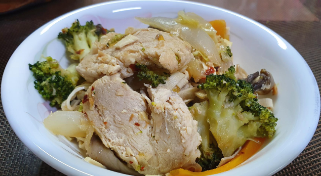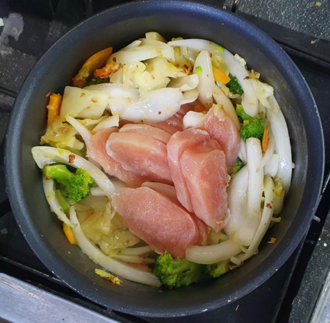 뚜껑을 닫아두면 야채와 닭가슴살에서 수분이 나온다.