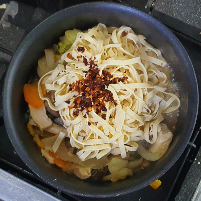 이 때 두부면을 넣고 페페로치노가루나 고춧가루를 약간 넣는다.