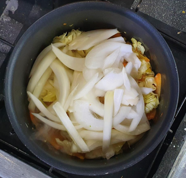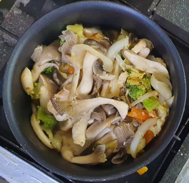 뚜껑을 덮어 야채들의 숨을 완전히 죽이고