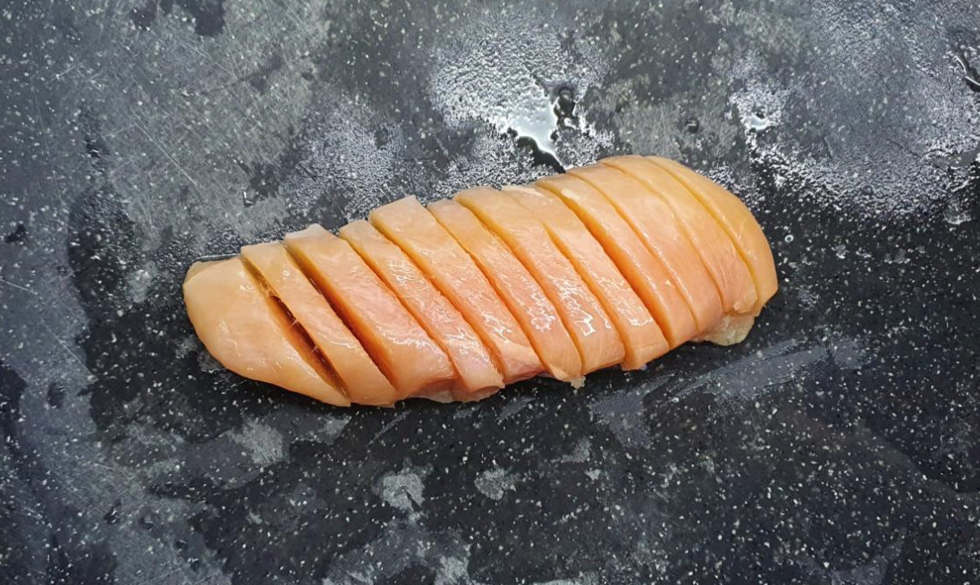 닭가슴살은 1센치 정도 두께로 슬라이스 한다.