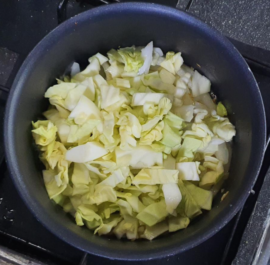 양파와 양배추가 숨이 죽으면 새우를 넣는다.