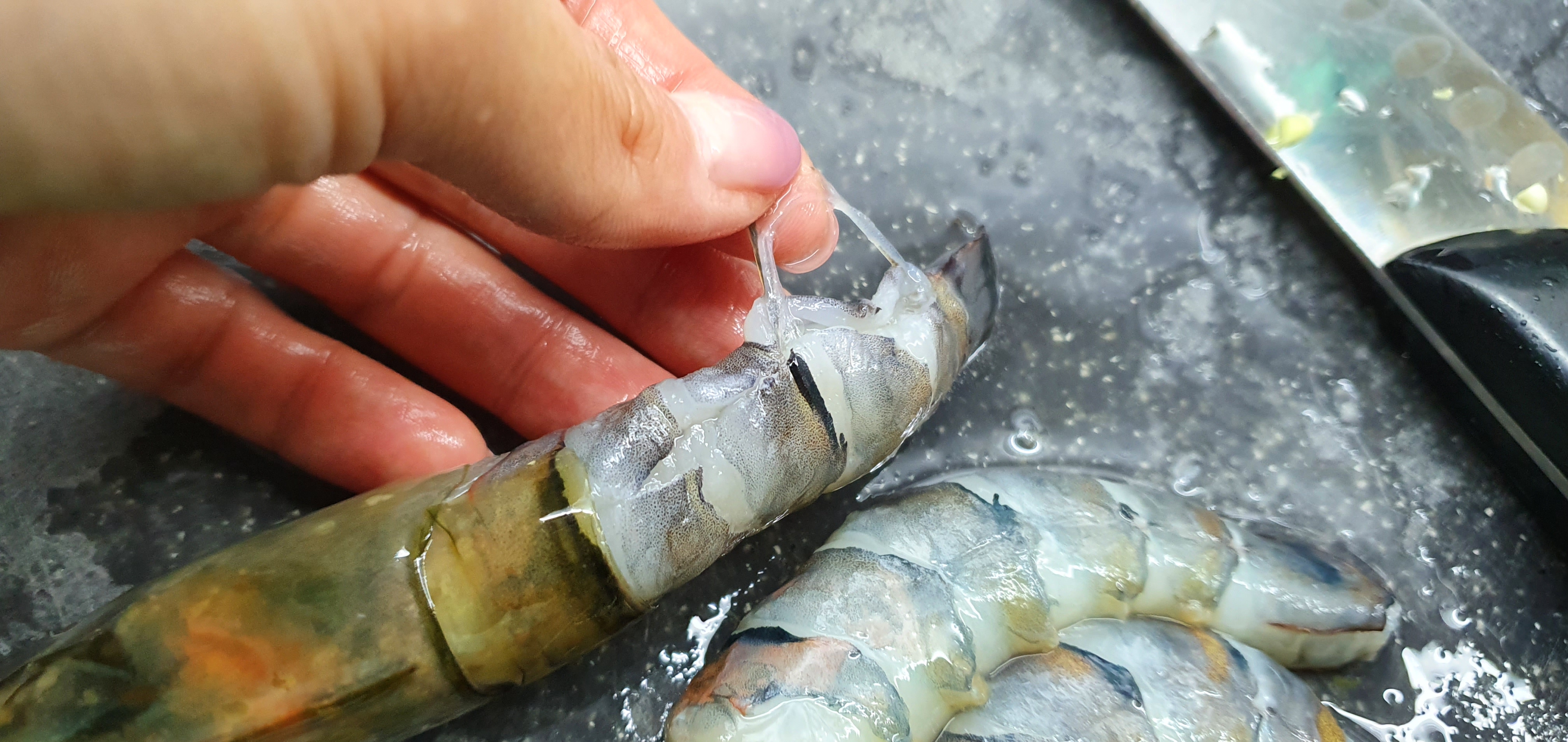 몸통 껍질을 벗겨서 등에 살짝 칼집을 내주면