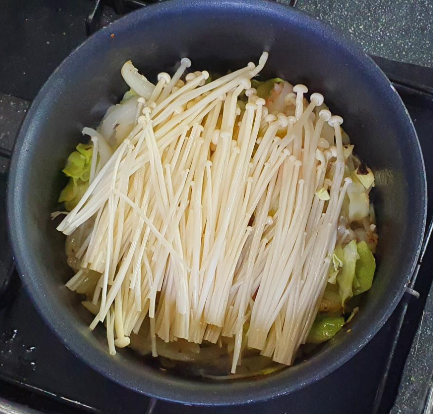 팽이버섯과 두부면을 넣고 볶는다.
