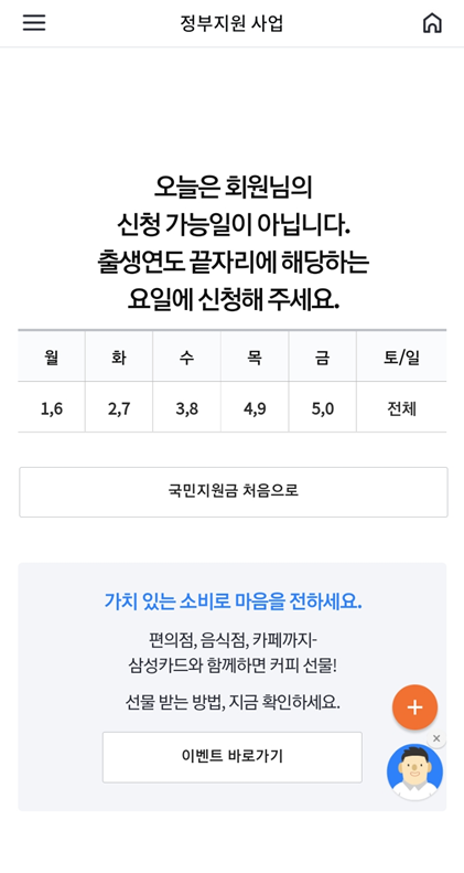 해당 요일에 접속하신 분들은 아래와 같이 국민지원금 조회/신청을 위한 페이지로 이동하게 됩니다.