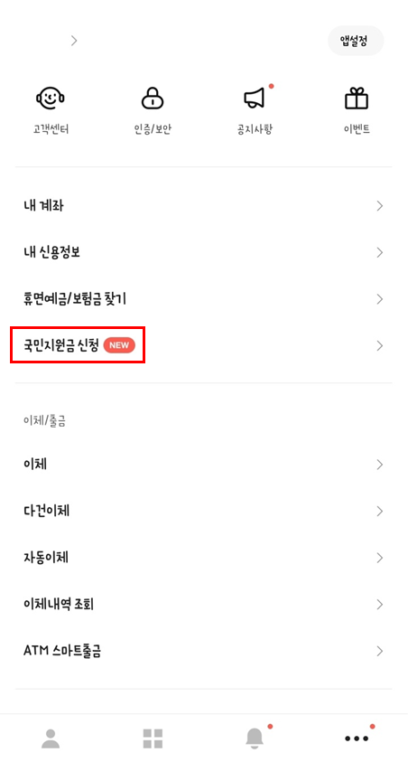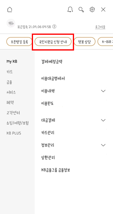 9월6일부터 '국민지원금 신청'메뉴가 추가되었습니다.