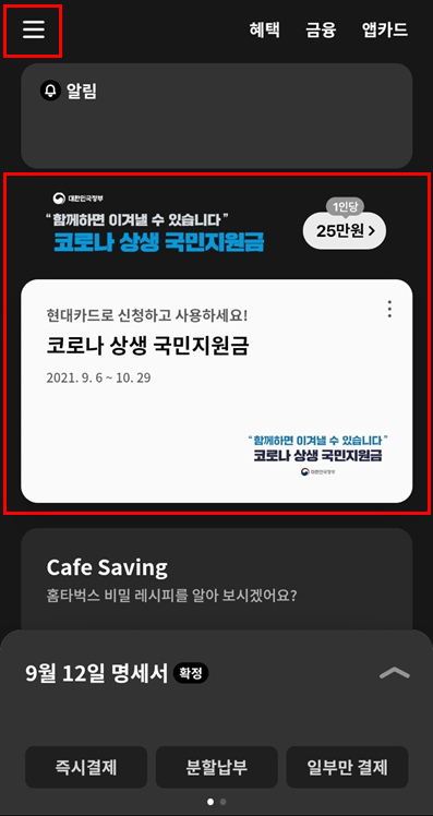 메뉴가 열리는데 '혜택' > '코로나 상생 국민지원금' 메뉴가 보입니다.