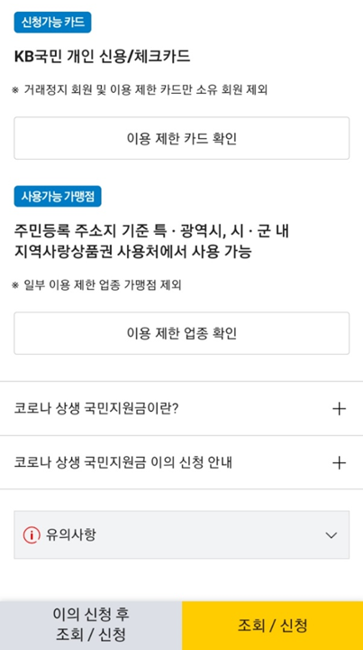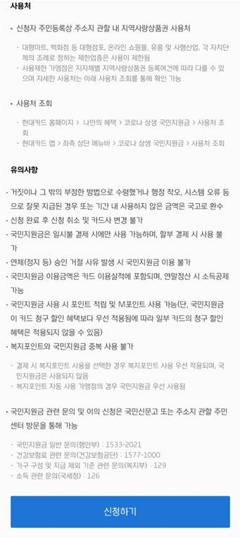 4가지 메뉴가 있고 아래는 신청기간, 신청자격, 지급 금액, 대상카드, 사용기간, 사용가능 지역, 사용처 등 유의사항에 대해 상세히 나와있습니다.