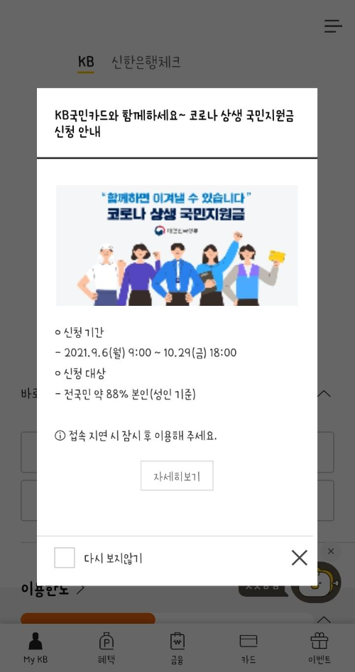 국민카드 앱에 접속하면 메인화면에 팝업창으로 국민지원금 신청안내가 나와요.