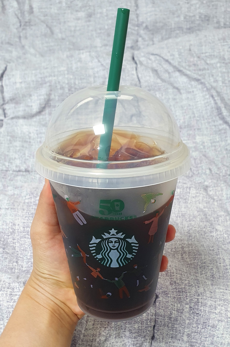 오늘은 모든 음료가 50주년 리유저블 컵에 담아주는것.