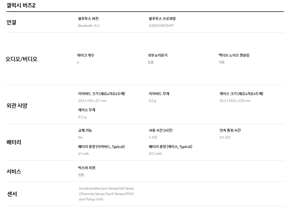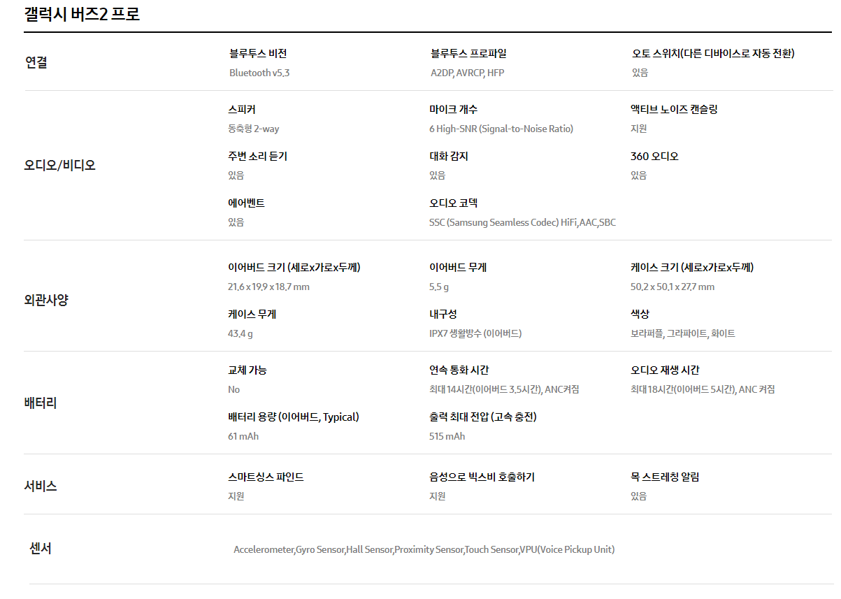 비교 하기위해 갤럭시 버즈2 사양을 가져와봤다.