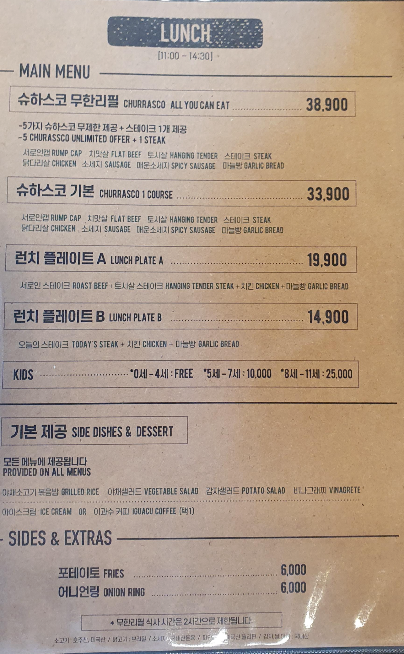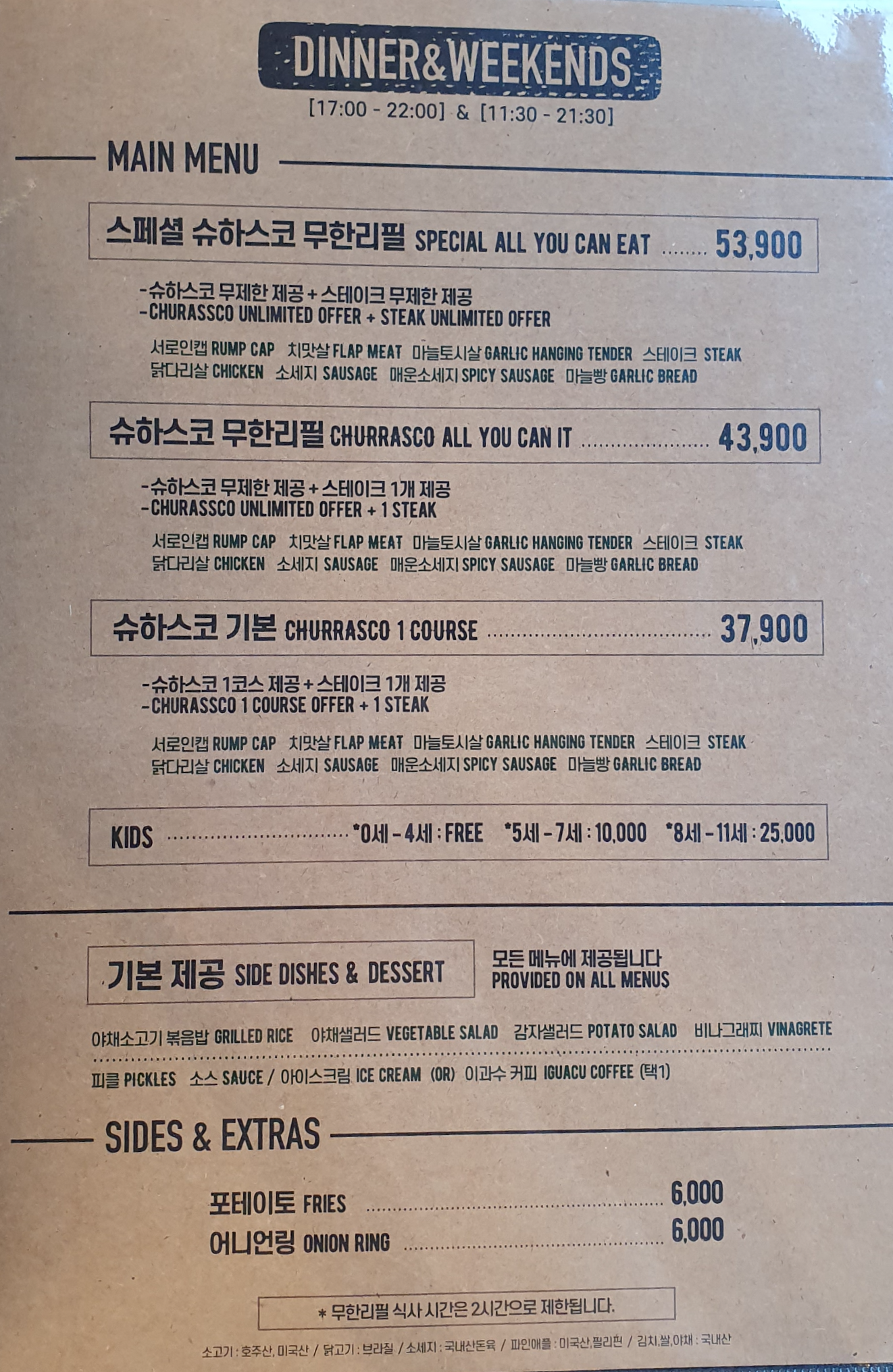 슈하스코 무한리필 코스, 슈하스코 + 스테이크 무한리필 코스가 있다.