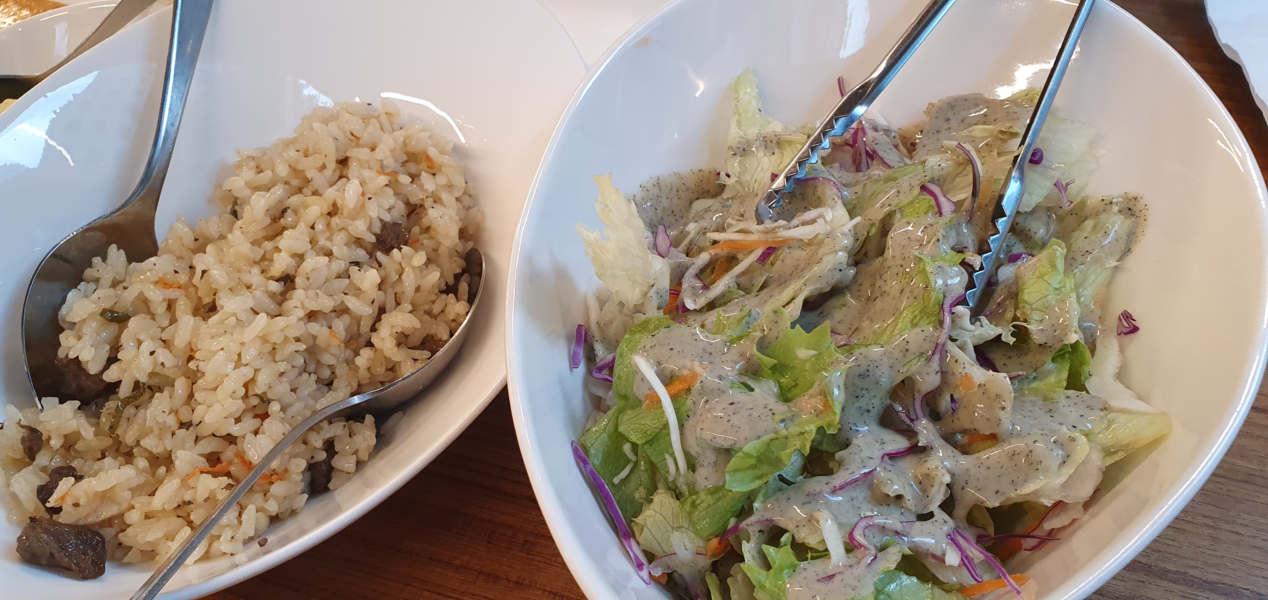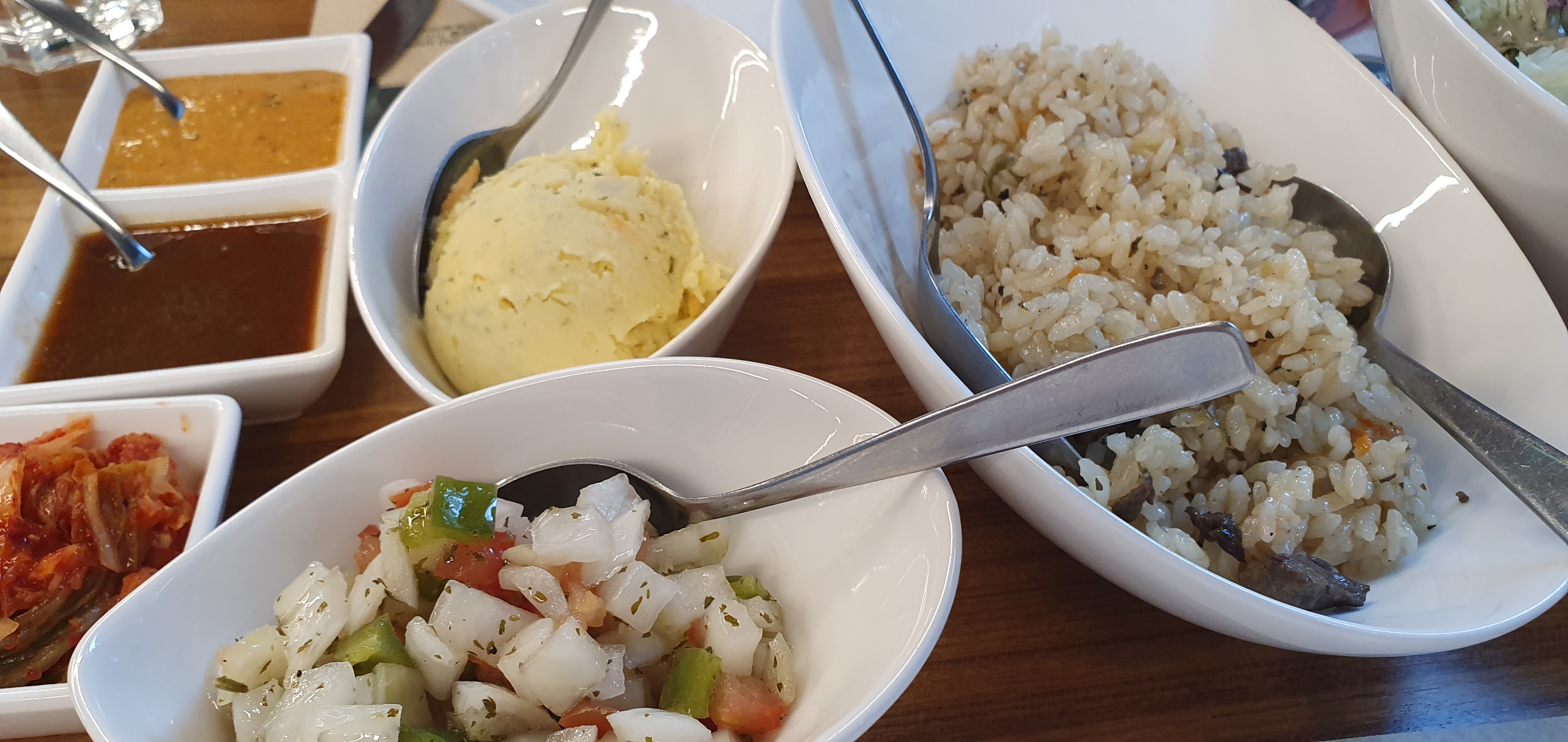 피클, 김치, 소스류, 비나그래찌, 감자샐러드, 야채소고기볶음밥, 야채 샐러드가 제공된다.